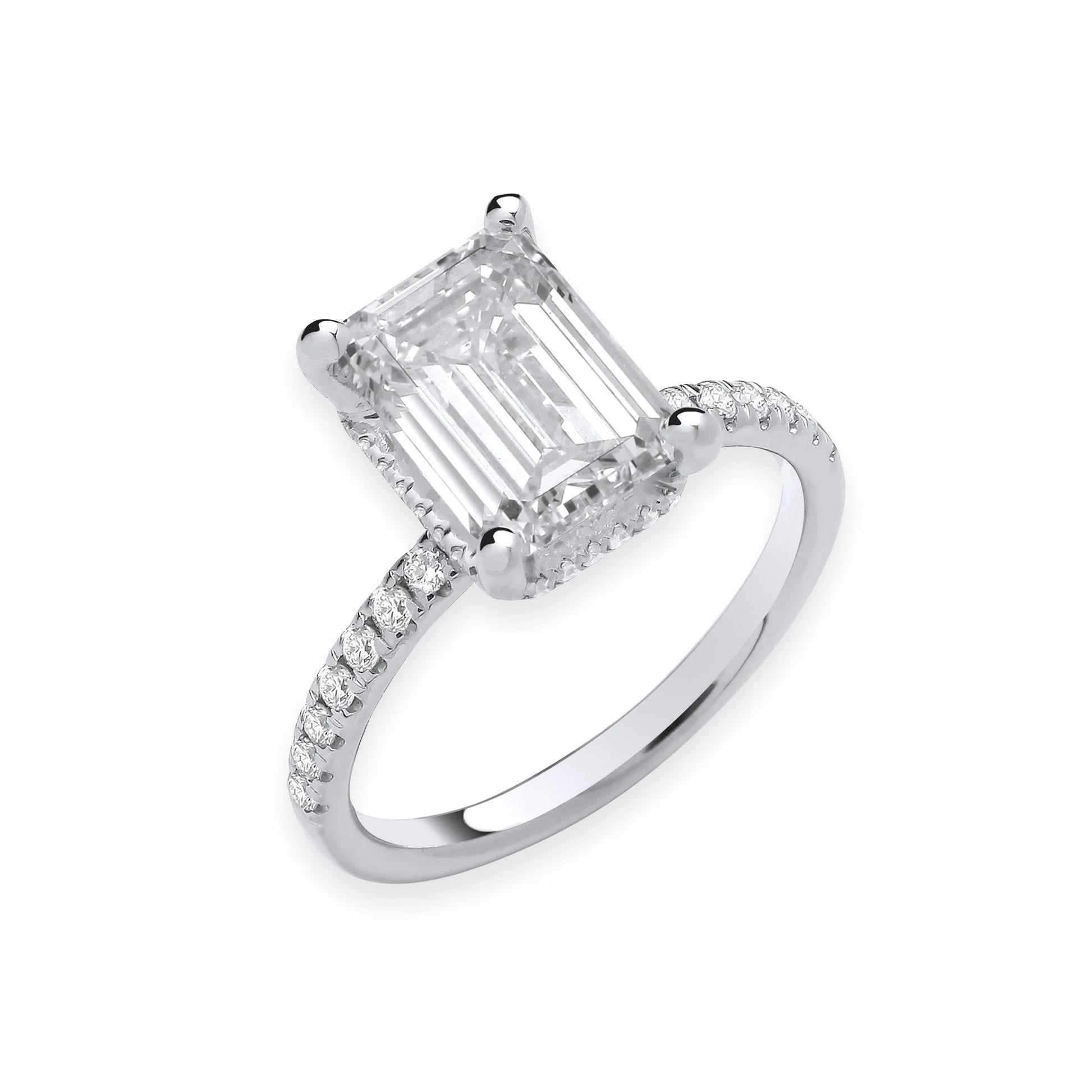 Exude modern luxury with the Luvien 3.30ct Emerald Cut Hidden Halo & Diamond Shoulder Engagement Ring in 18ct White Gold.